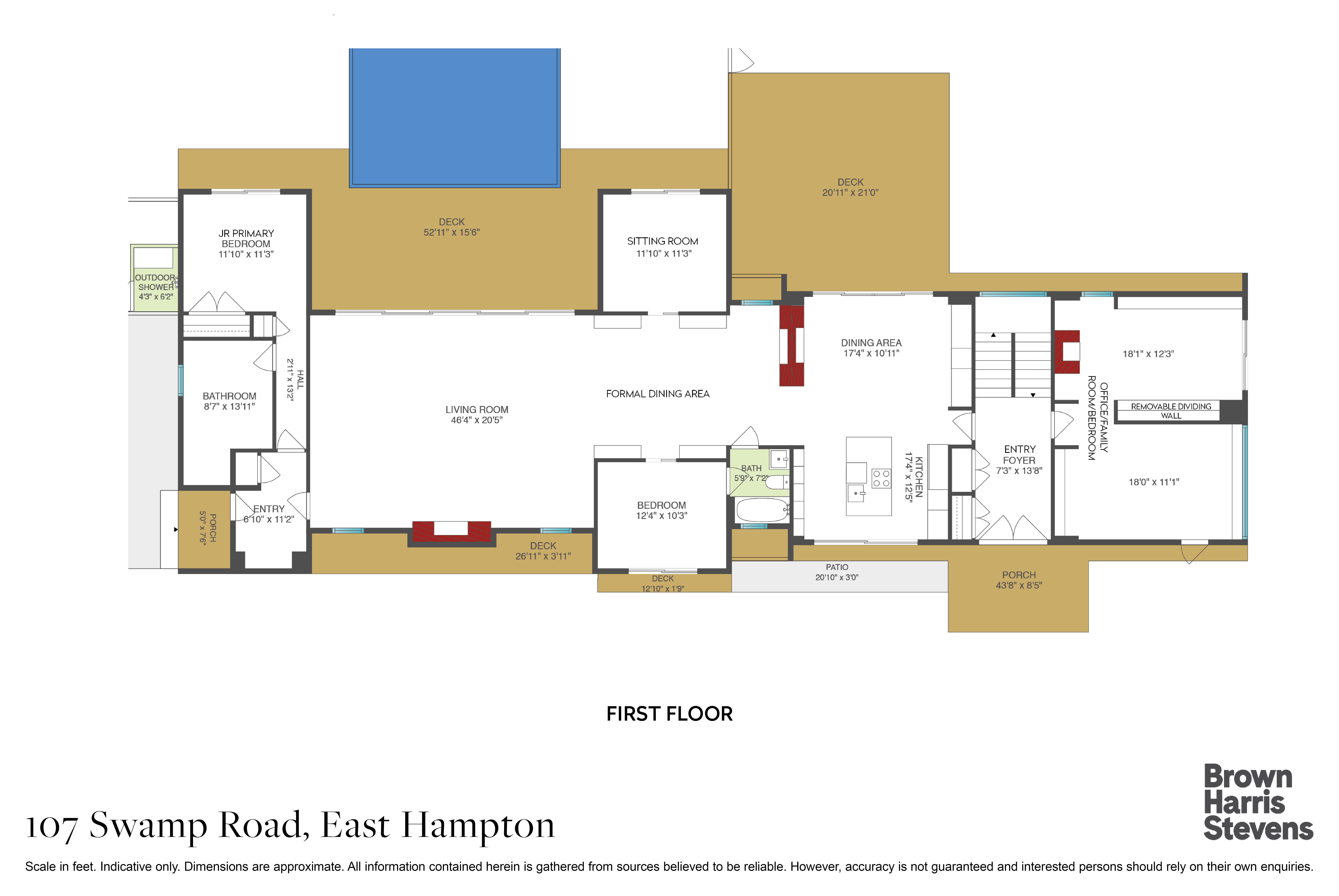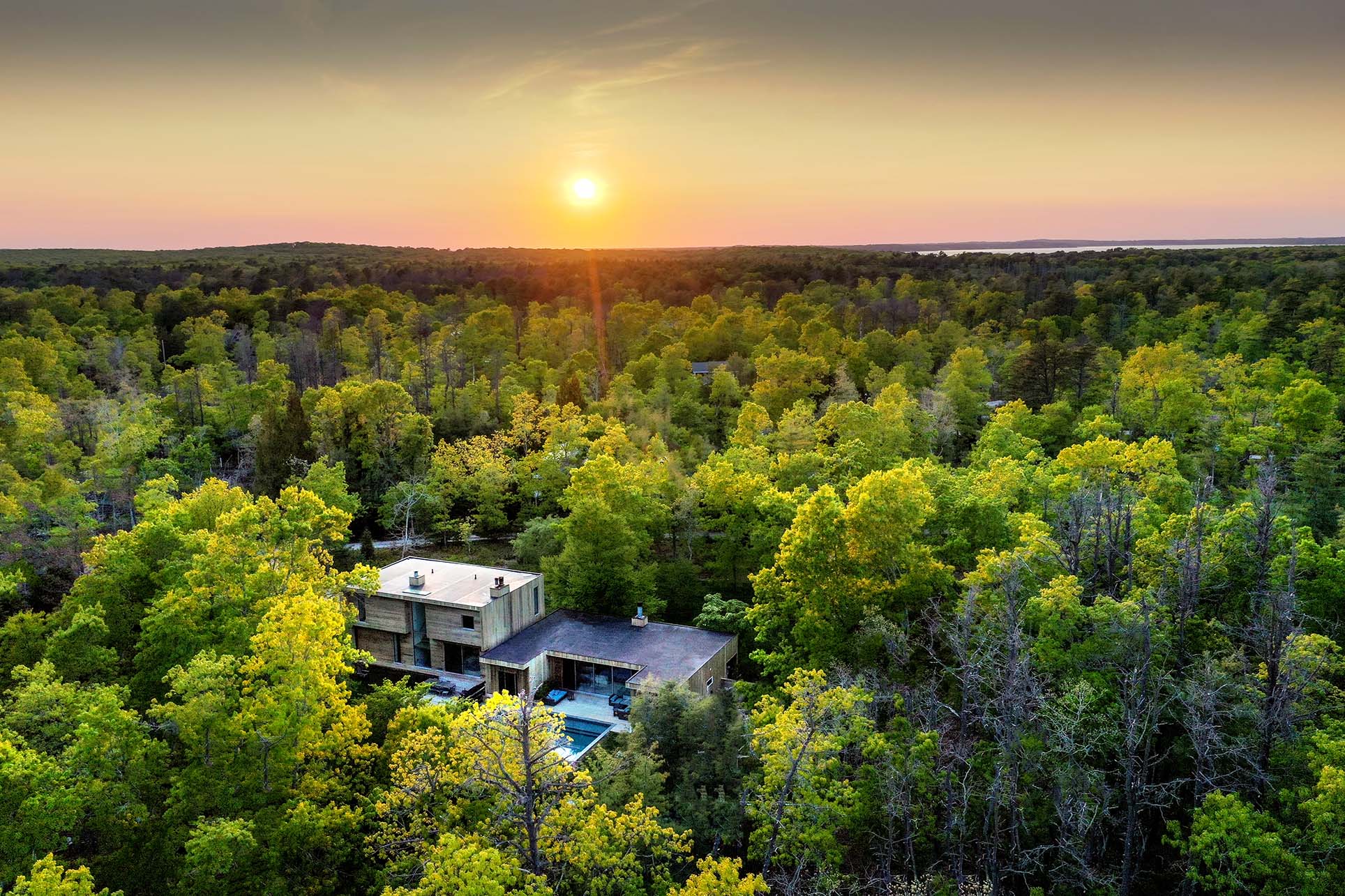Modern living in this 4000 +/- sq. ft home ideally located between the villages of East Hampton and Sag Harbor. Down a long private driveway, stunning architecture blends into the 2 acres of natural surroundings with wonderful specimen trees, bright space and rolling lawn. The main level features an open floor plan; a custom eat-in kitchen with stainless island, dining area with fireplace, a den, living room with double height ceilings and fireplace, an ensuite junior primary guest room and an ensuite bedroom. A large additional room with fireplace currently set up as two home offices complete this floor. Up the floating staircase, there is a gracious primary suite with luxurious adjoining bath and walk-in closet, and a second large bedroom with a private sitting room. The lower lever features a windowed recreation room along with a half bath. Providing resort-like amenities for entertaining, the heated gunite pool centers the back lawn with connected dining and lounging patios.